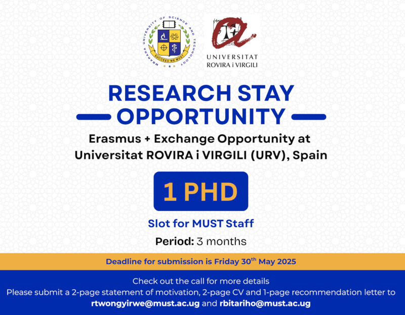 The Universitat Rovira I Virgili (URV, Spain) and Mbarara University of Science and Technology (MUST) have received a KA 171 grant under the Erasmus+ Programme – funded by the European Union – to support mobility of a member of staff of MUST pursuing a PhD, who would like to spend a 3-month research stay at URV, Spain. The support is available to a candidate looking to finalise his/her PhD thesis.