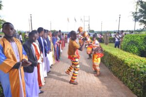 The Grand Assembly: Inside a packed auditorium, hundreds of students and staff greeted the Katikkiro. A diverse choir performed the national and cultural anthems in beautiful harmony, setting a prestigious tone for the afternoon.