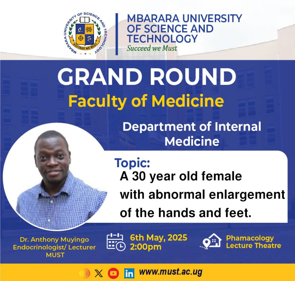 In this grand round, we present a case that illustrates the classic features of acromegaly, with a particular focus on its association with diabetes mellitus. The discussion will explore the patient’s presentation, the diagnostic journey, and key aspects of management. The session will be led by Dr. Anthony Muyingo, an endocrinologist and senior lecturer in the Department of Internal medicine.