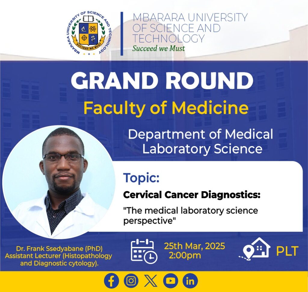 This Grand Rounds session will focus on Cervical cancer diagnostics” the medical laboratory science perspective.” This will be led by Dr. Frank Ssedyabane (PhD, an Assistant lecturer at Mbarara University of Science and Technology Department of Medical Laboratory Science. Dr. Frank Ssedyabane is specialized in Histopathology and Diagnostic cytology.