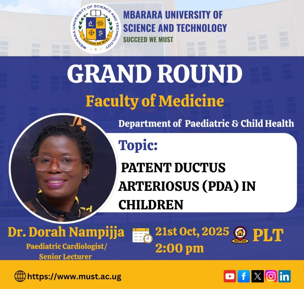 This Grand Rounds session will focus on the Patent Ductus Arteriosus (PDA) in Children. This will be led by Dr. Dorah Nampijja, she is a Paediatric Cardiologist and Senior lecturer at Mbarara University of Science and Technology Department of Paediatric & Child Health.