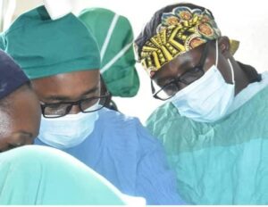 Left: Dr. Kajabwangu assisting Associate professor Joseph Ngonzi