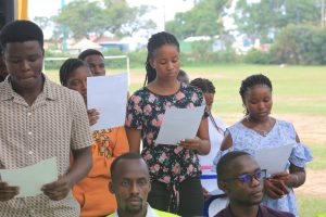 Mr. Emmanuel Kyagaba, the Dean of Students, addressed the new students, expressing gratitude and highlighting the successful orientation activities carried out by various university departments. He noted that the Academic Registrar’s Department and student guild leaders played a key role in the smooth reporting process. Following his remarks, students took the oath of allegiance, pledging to uphold the university’s values of truth, diligence, and discipline.